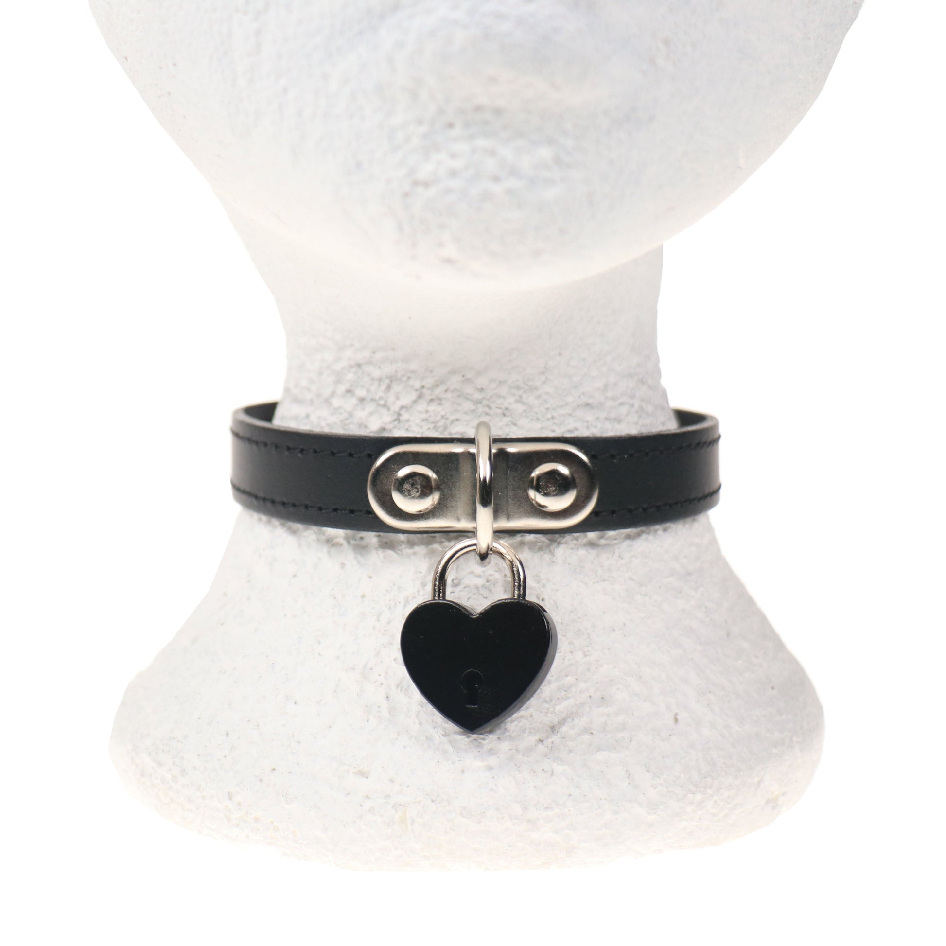 NB321A 1 ROW BLACK STITCH WITH SMALL BLACK HEART PADLOCK Leather Choker - Real Leather - Made in England