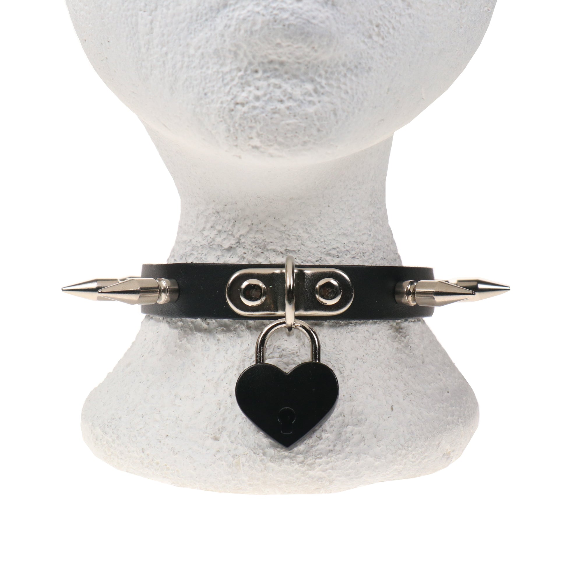 NB323D 1 ROW MEDIUM SPIKE AND BIG BLACK HEART PADLOCK Leather Choker
