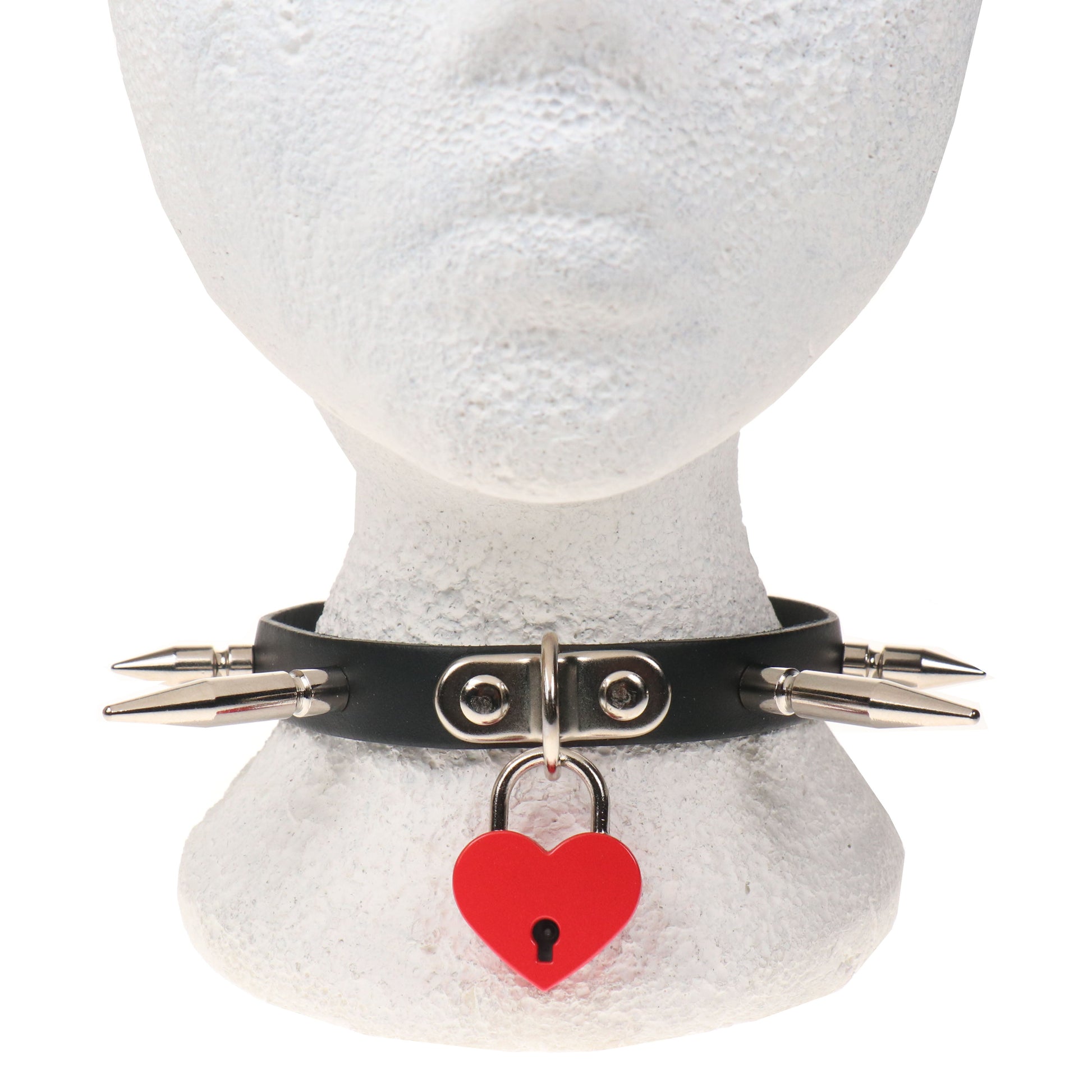 NB325E 1 ROW SMALL,MEDIUM AND LARGE SPIKE AND BIG RED HEART PADLOCK Leather Choker
