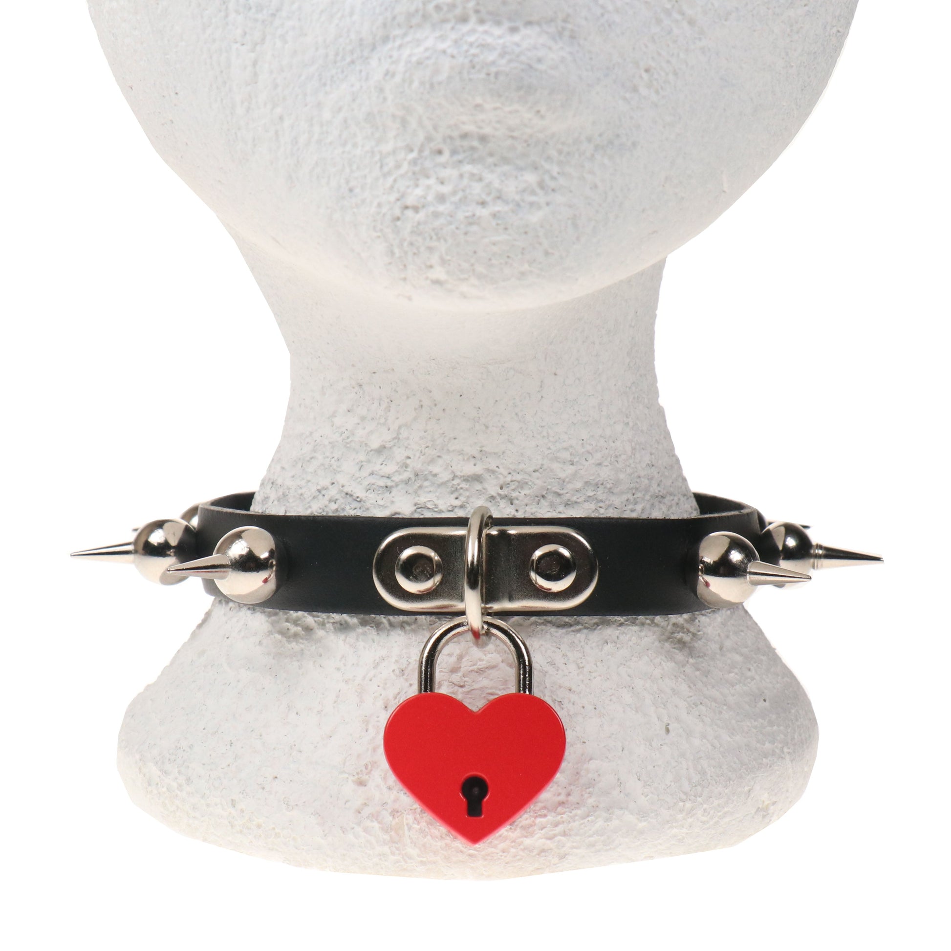 NB328E 1 ROW BALL SPIKE WITH BIG RED HEART PADLOCK Leather Choker
