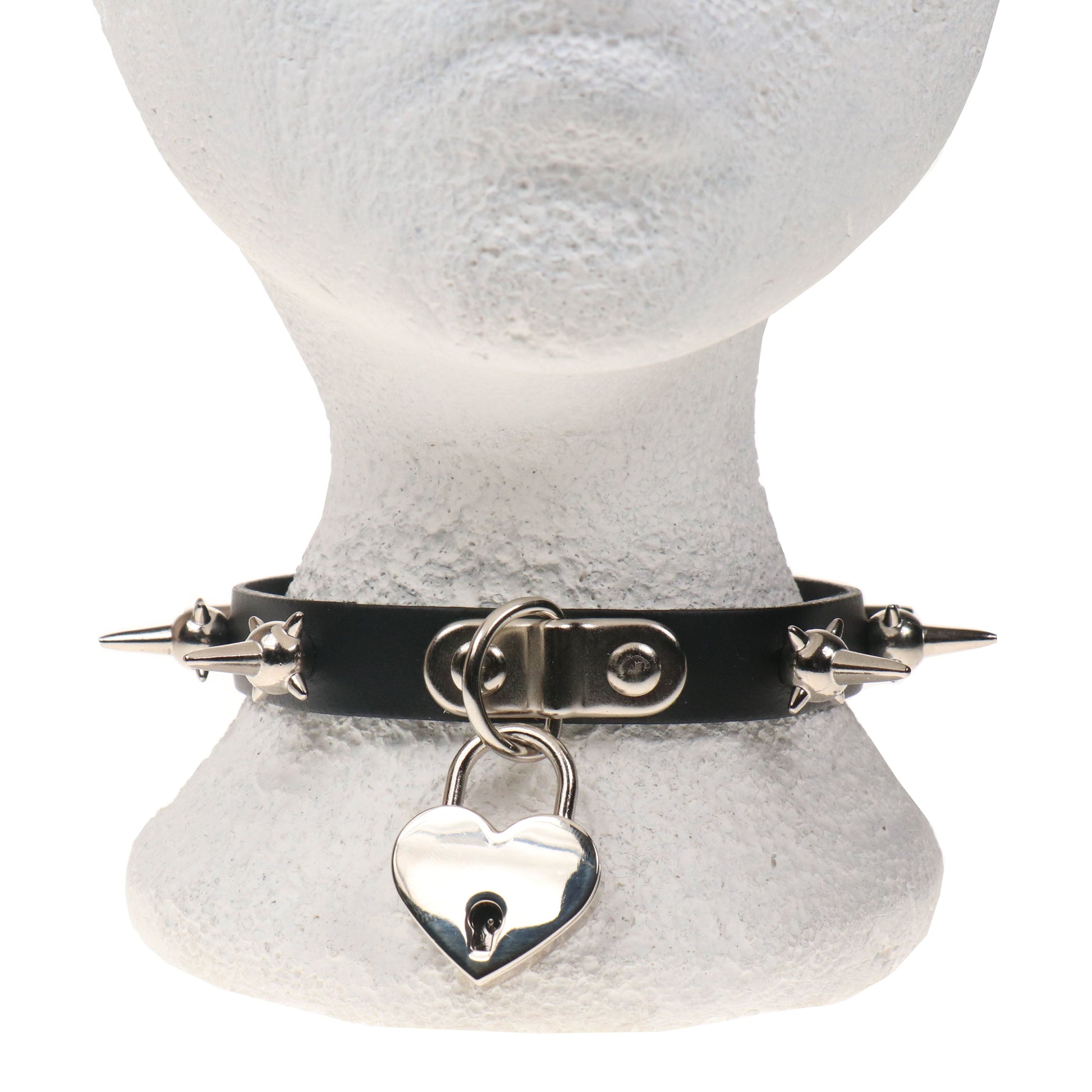NB329C 1 ROW MINE SPIKE WITH BIG HEART PADLOCK Leather Choker - Real Leather - Made in England