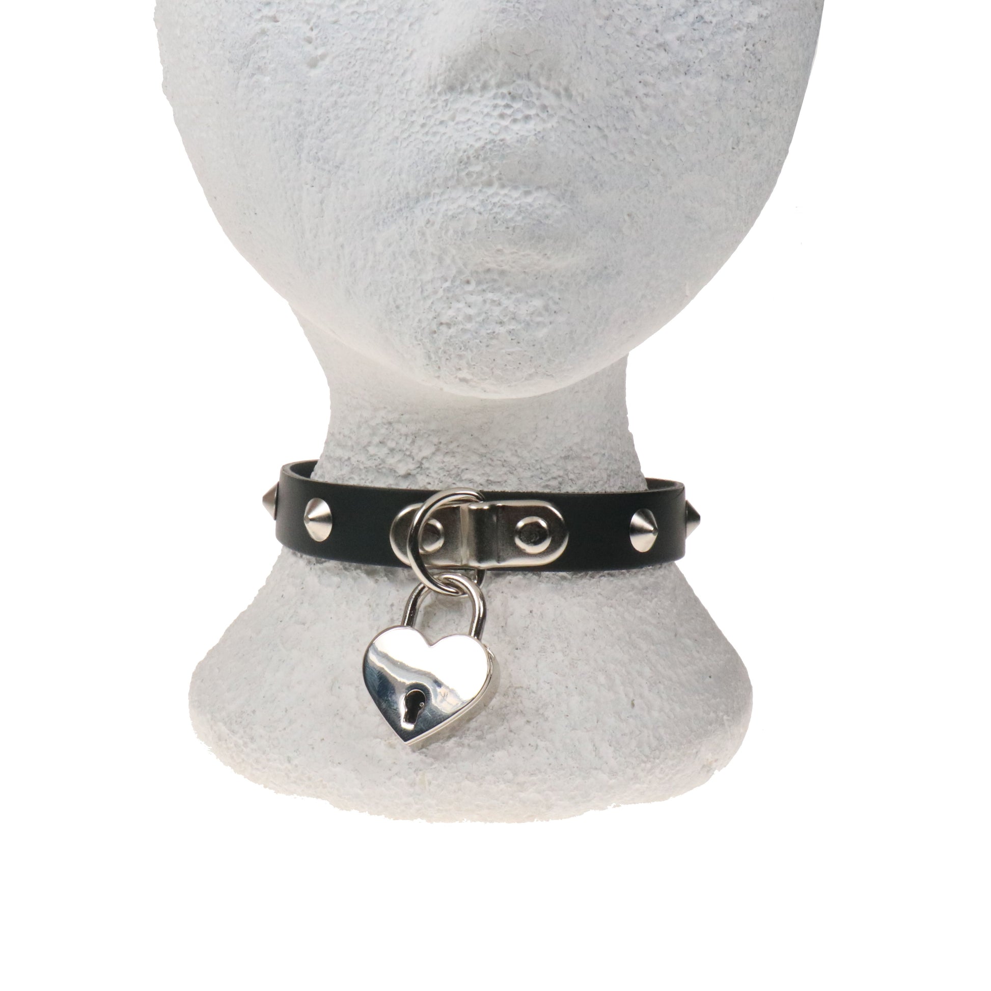 NB333C 1 ROW CONICAL WITH BIG HEART PADLOCK Leather Choker - Real Leather - Made in England