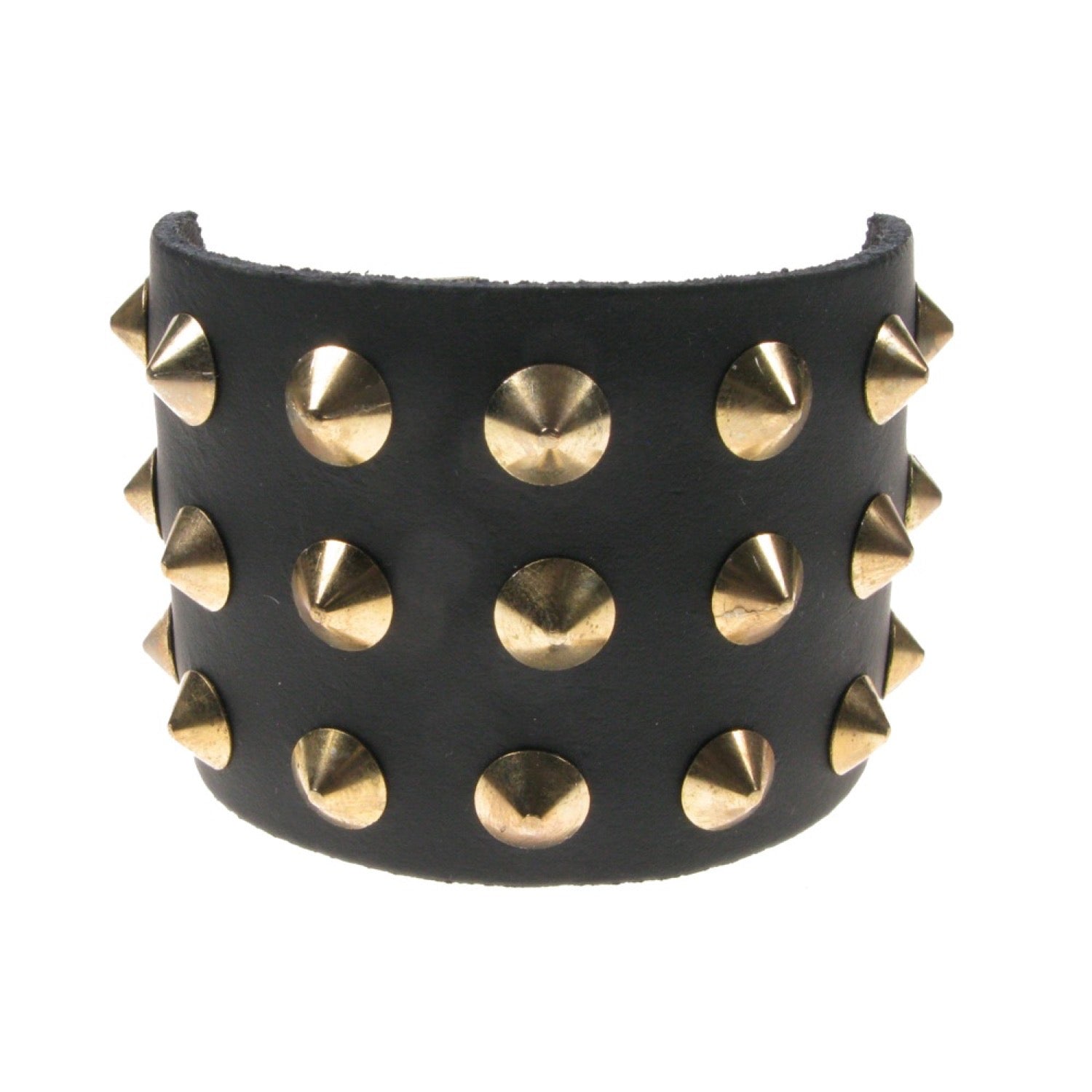 WB003G 3 Row Gold Conical Leather Wristband - Black