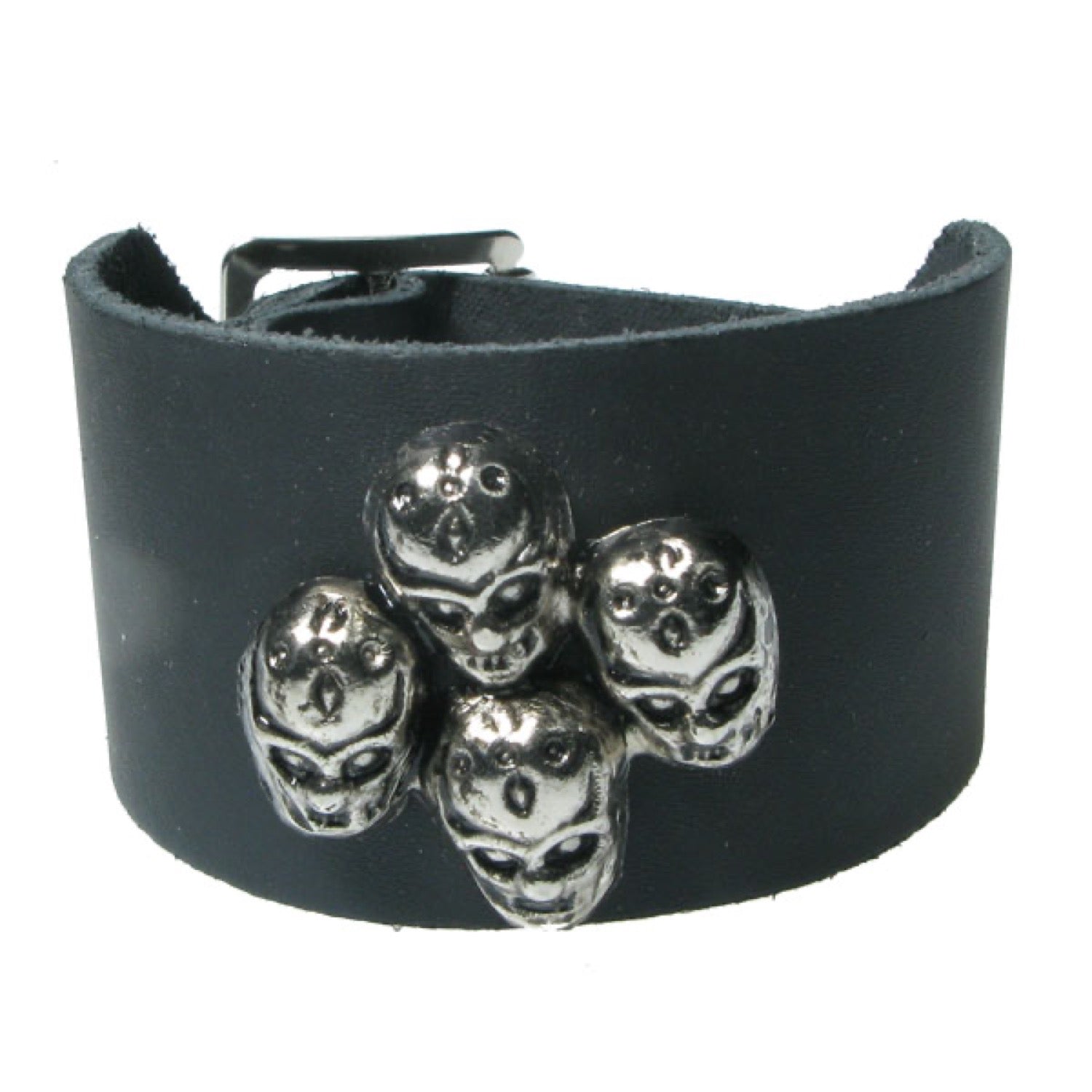 2 Row width 4 Skull Metal Fitting - Black Leather Wristband