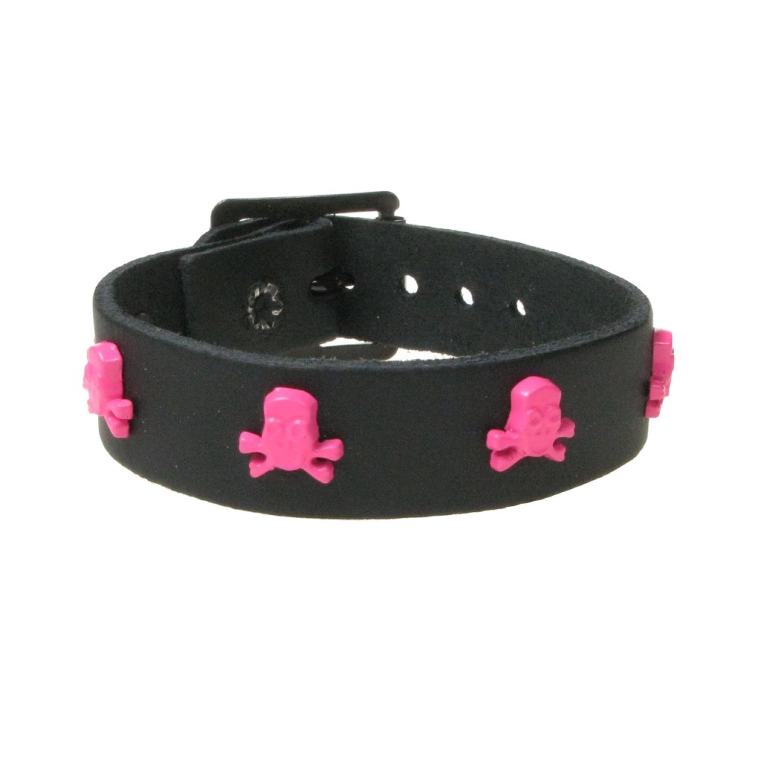 1 ROW SKULL & CROSSBONES FITTING FLUORESCENT PINK - BLACK Leather Wristband